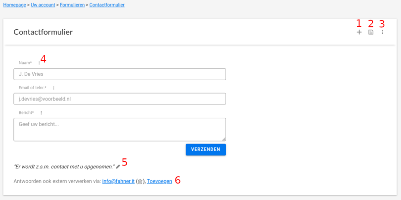 Wanneer een gebruiker het formulier invult wordt een kopie van de antwoorden opgeslagen op de website. Onder het kopje Formulieren bewerken (knop nr. 2) kunt u zien hoe u bij deze antwoorden terecht kunt komen. Aangezien er vaak privégegevens verwerkt worden, worden deze antwoorden maximaal 90 dagen opgeslagen op de website om de impact van het potentiëel uitlekken van de database te beperken. Als u deze gegevens verder (meer permanent) wil verwerken zal u het formulier dus moeten koppelen aan een ander systeem.